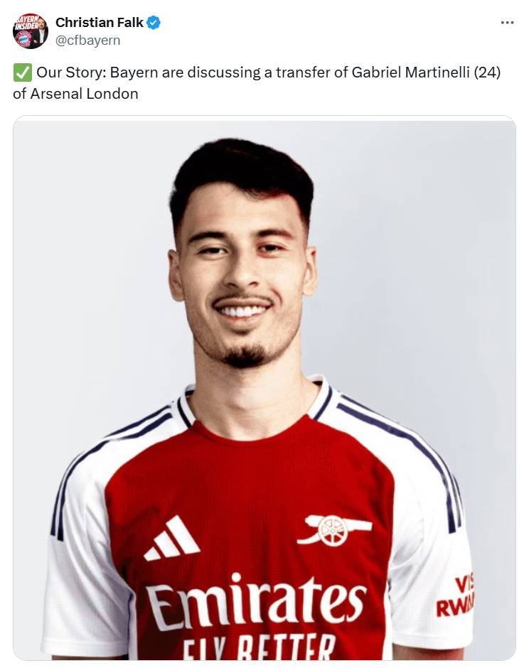 法尔克表示:我们获悉,拜仁正在讨论从阿森纳引进24岁的马丁内利。