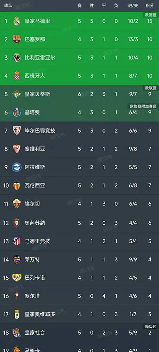 北京时间9月21日,西甲联赛进行了第5轮,共进行了6场比赛,让我们看看最新的积分榜吧!